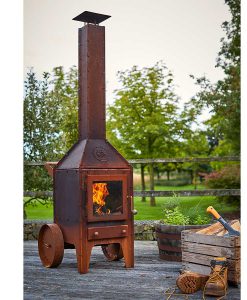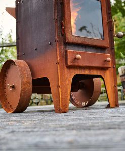 Das Bijuga-Modell ist ein solider Corten-Stahl Gartenkamin. Das markante zeitlose Design verbindet enge Linien und Oberflächen mit industriellen Akzenten. Dadurch wird das Blattmaterial an den Verbindungsnähten ausgeklappt und alle Schrauben und Muttern sind sichtbar. Die Hartholz-Merbau-Teile (Knöpfe und Griff) bieten nicht nur schöne Details, sondern sind auch sehr praktisch für den Betrieb, weil sie nicht zu heiß werden. Die 2-Rad-Version hat eine Schubstange auf der Rückseite so dass das Gerät problemlos bewegt werden kann. Das Emblem auf der Haube ist ein Symbol für die Zusammenarbeit mit Atelier René Knip, der Designer dieses Gartenkamins.