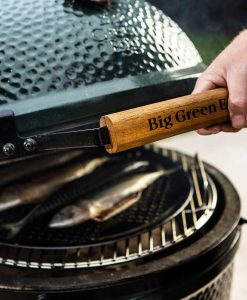 Der hölzerne Griff ist am oberen Halteband des Big Green Eggs befestigt. Mit dem Griff lässt sich der Keramik-Deckel mit dem Schornstein ganz leicht öffnen, um das EGG gebrauchsfertig zu machen oder Zutaten auf den Rost zu legen. Der Name Big Green Egg ist im hölzernen Griff eingebrannt.