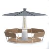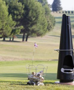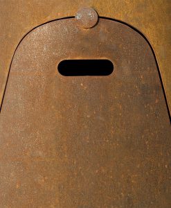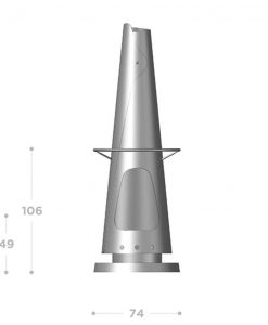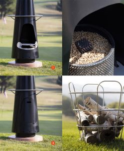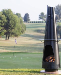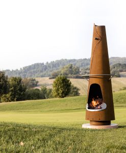 Raum und Funktion vereinen sich zu einem einzigen Element: Im Inneren eines Metallkegels aus lackiertem Stahl oder aus COR-TEN-Stahl lodert das Feuer und auch der Rauch zieht über ihn ab. Der Kamin steht auf einem Sockel aus buntem Marmorsplitt und dreht um sich selbst, so dass an windigen Tagen die bestmögliche Ausrichtung gewählt werden kann.