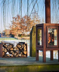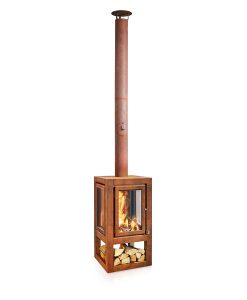 Modell XXL ist das größte der Reihe. Mit seiner Höhe von 105 cm ist er ein echter Eye-catcher auf der Terrasse. Durch die große Glasfläche haben Sie einen schönen Blick auf die Flammen. Es sind sehr solide Gartenkamine mit einem industriellen Aussehen. Die Kubusförmigen Kamine haben einen einzigartigen modularen Aufbau und können daher beliebig mit 1 (Tür) bis 4 Glasscheiben ausgeführt werden. Der Türverschluss ist zwischen der Türverkleidung und dem rechten Bein verborgen. Die Version mit 4-Rad-Plattform ist leicht zu bewegen. Das Plateau kann auch als Lager für den ersten Brennholzbestand genutzt werden.